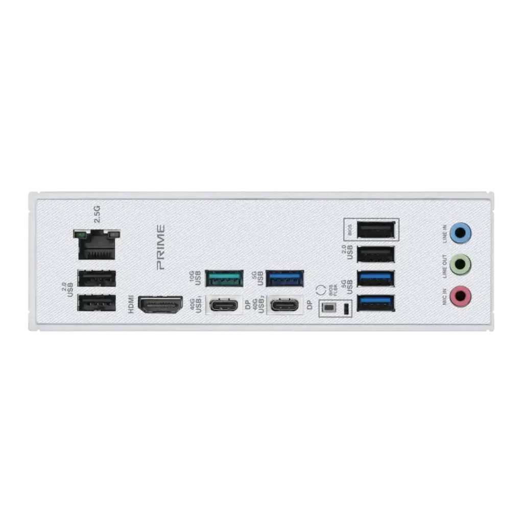 2 x USB4® (40Gbps) ports (2 x USB Type-C®) 1 x USB 10Gbps port (1 x Type-A) 3 x USB 5Gbps ports (3 x Type-A) 4 x USB 2.0 ports (4 x Type-A) 1 x HDMI™ port 1 x Realtek 2.5Gb Ethernet port 3 x Audio jacks 1 x BIOS FlashBack™ button |